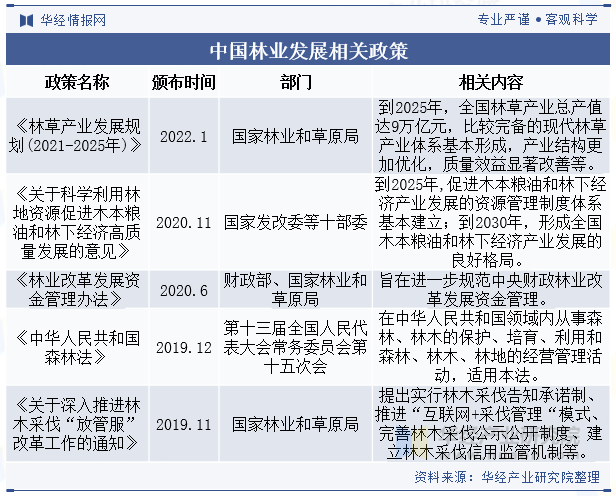 近年來,我國林業(yè)政策不斷推陳出新,旨在推動林業(yè)產(chǎn)業(yè)的可持續(xù)發(fā)展、保護生態(tài)環(huán)境、促進農(nóng)民增收致富,從國家級到地方級,各級政府紛紛出臺了一系列林業(yè)政策,為林業(yè)發(fā)展提供了強有力的支持。